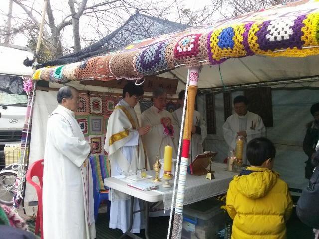 그런 염려와 안타까움을 저도 이해는 합니다. 그러나 저도 그렇고, 여기서 미사 지내는 사제들도 그렇고 이 시끄럽고 품위 없고 시끄러운 길바닥에서 간이 제대 놓고 미사 드리고 싶은 사람, 아무도 없습니다. 저도 주교회의 전례위원장을 9년이나 하면서 전례에 대해 애착을 가지고 있고, 전례의 규범을 아끼는 사람이었습니다. 하느님께 합당한 예배를 드리고 싶은 사람입니다. 그런데 차츰 나이를 먹어가면서, 이 강정의 일이 벌어지면서 미사가 무엇일까, 성체성사가 무엇일까, 새롭게 음미하고 반성하게 됩니다.
