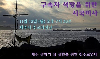 Nov. 12 poster by the Jesuits Korea (Caption by Regina Pyon): At 7.30 p.m. on November 12, Catholic mass is held officiated by Bishop Peter Kang U-il at Jeju cathedral for the release of Jesuit priest, Lee Young-Chan S.J, and imprisoned peace activists. It was organized by the Catholic Solidarity for Peace Island Jeju, that 15 national justice and peace commissions and representatives of lay and religious committees are participating. Bishop Peter Kang is also chairperson of Catholic Bishops’ Conference of Korea.