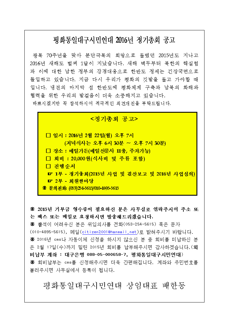 2016년 정기총회 공지 작성자청춘|작성시간16.02.02|조회수73 목록 댓글 0 글자크기 작게가 글자크기 크게가 다음검색 현재 게시글 추가 기능 열기 북마크 공유하기 신고 센터로 신고 댓글 댓글 0 댓글쓰기 답글쓰기 댓글 리스트