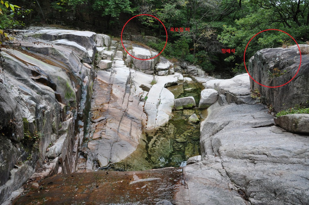 와운루 소월담 주변의 육모정터(원안의 윗쪽바위)와 이중환의 별서 정자가 있던 것으로 추정되는 정배석이다.