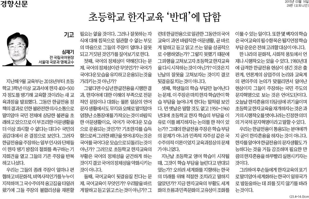 더욱이 국민 전체에게 상당한 불편을 주어 더는 두고 볼 수 없다는 게 많은 사람의 뜻이라고 했지만 이 말도 사실과 다르다. 한글로만 써서 불편한 건 국민이 아니라 이 땅의 먹물들이 아닐까. 남들 모르는 한자를 휘휘 갈기듯 써서 지식을 뽐내고 거들먹대야 하는데 그러지 못해서 안타까운 게 아닐까. 한글로만 써서 말이 통하지 않는다고 하면서 심재기 전 원장이 신문에 낸 글을 보라. 한자 하나 섞지 않았다. 거꾸로 앞엣말을 한자를 바꿔 아래처럼 신문에 냈더라면 어땠을까.