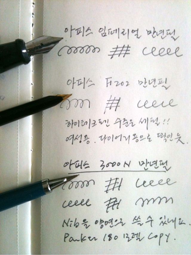 아피스 3000N 만년필은 특이한 촉(닙)을 가지고 있는 양면닙입니다, 한쪽은 가늘게(EF), 한쪽은 굵게(M) 쓸 수 있어요.