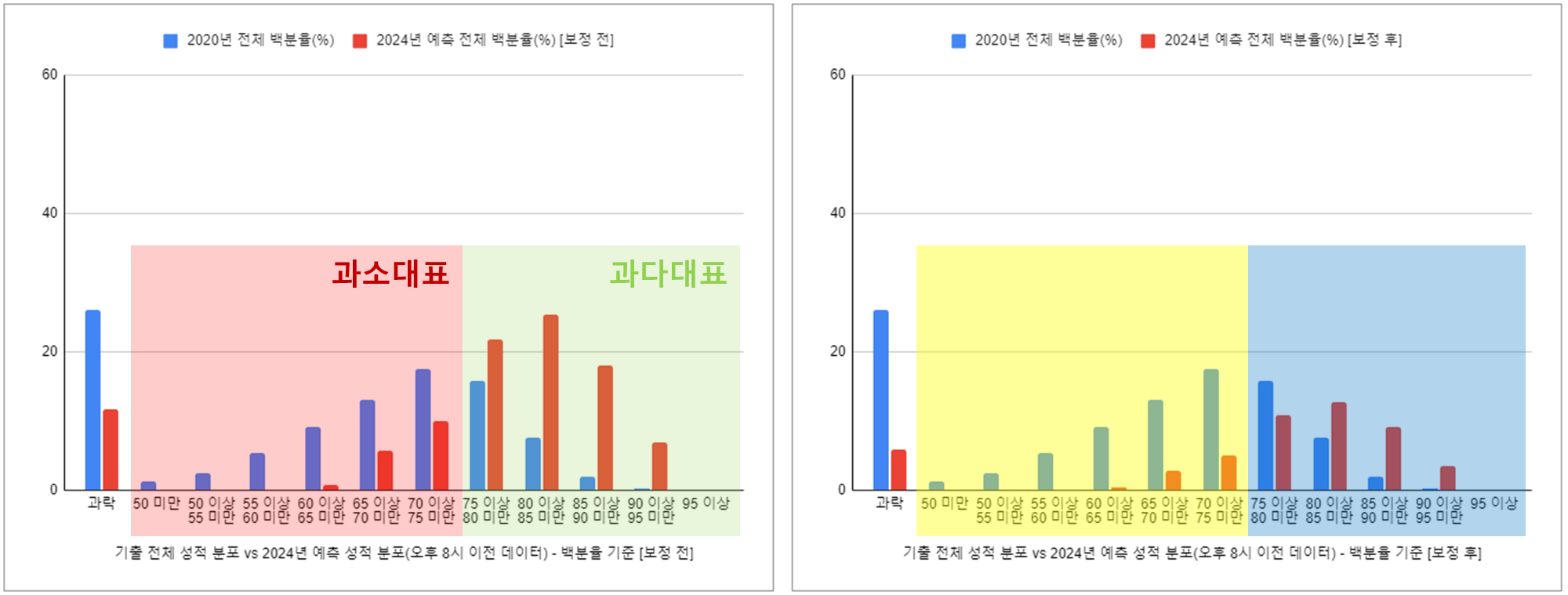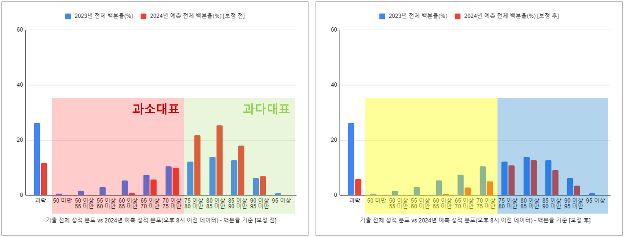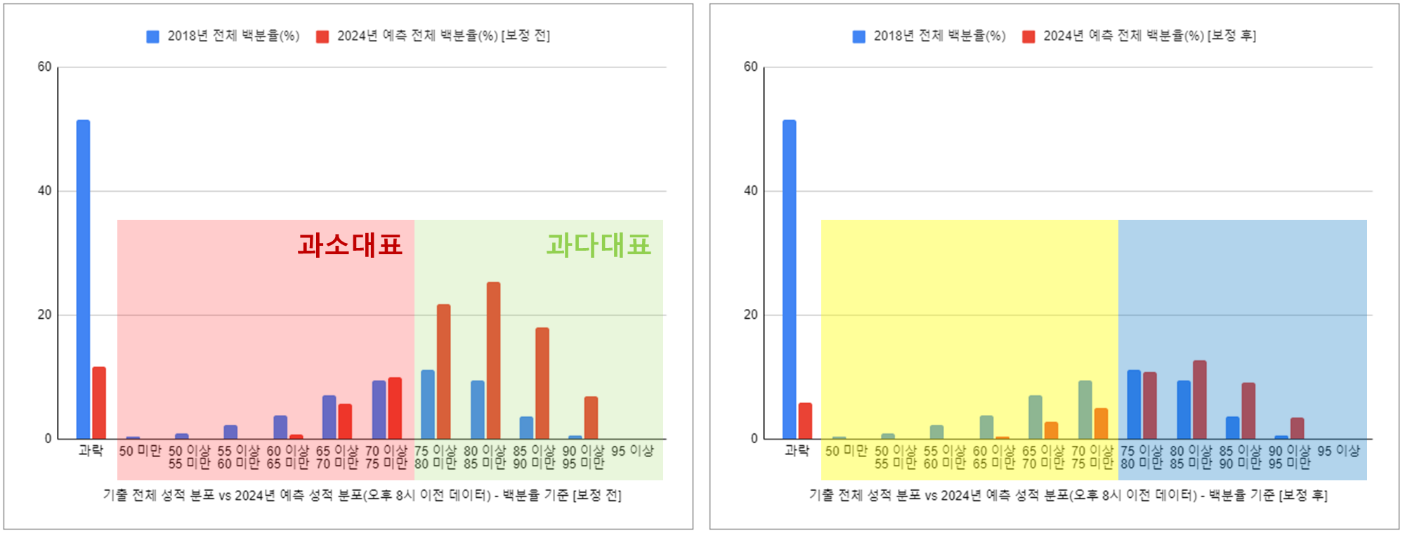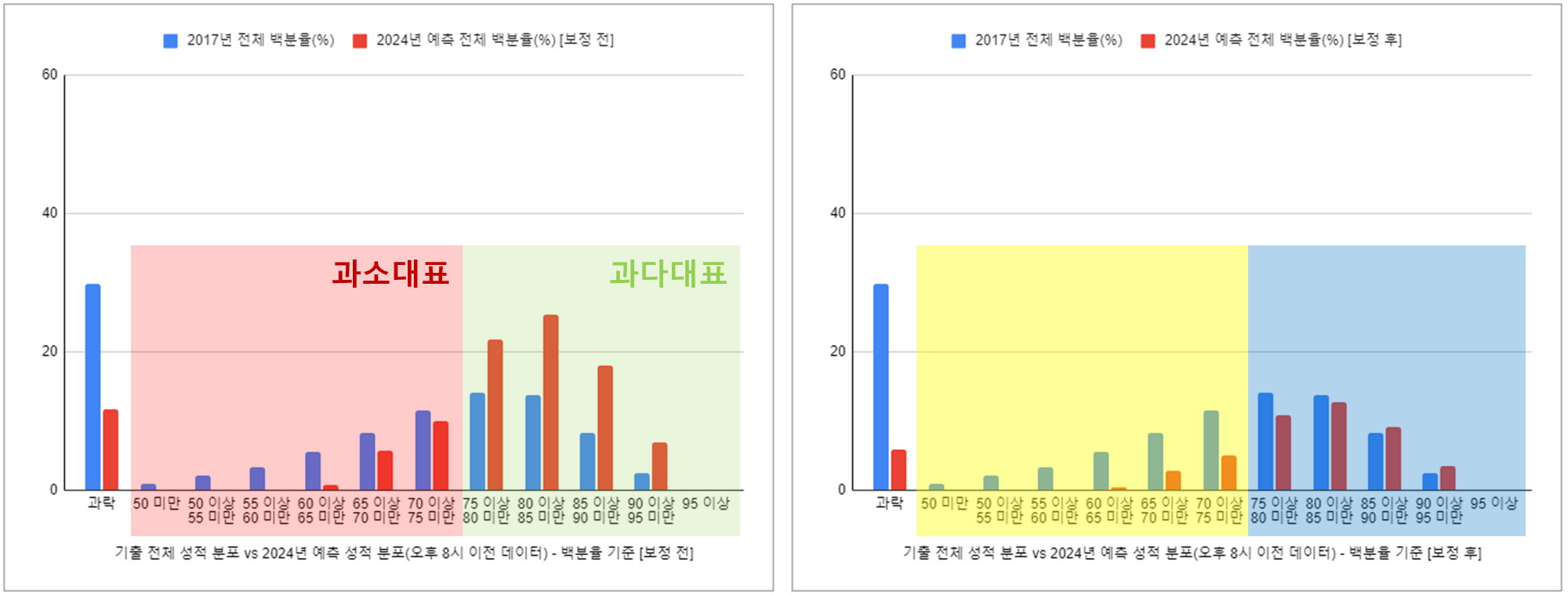 이 보정값은 이후 각 연도별 기출 통계와 비교할 때도 똑같이 적용했습니다.