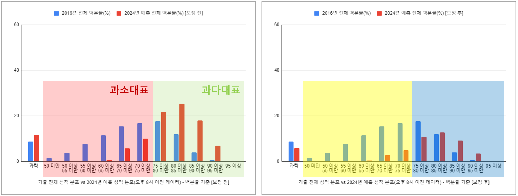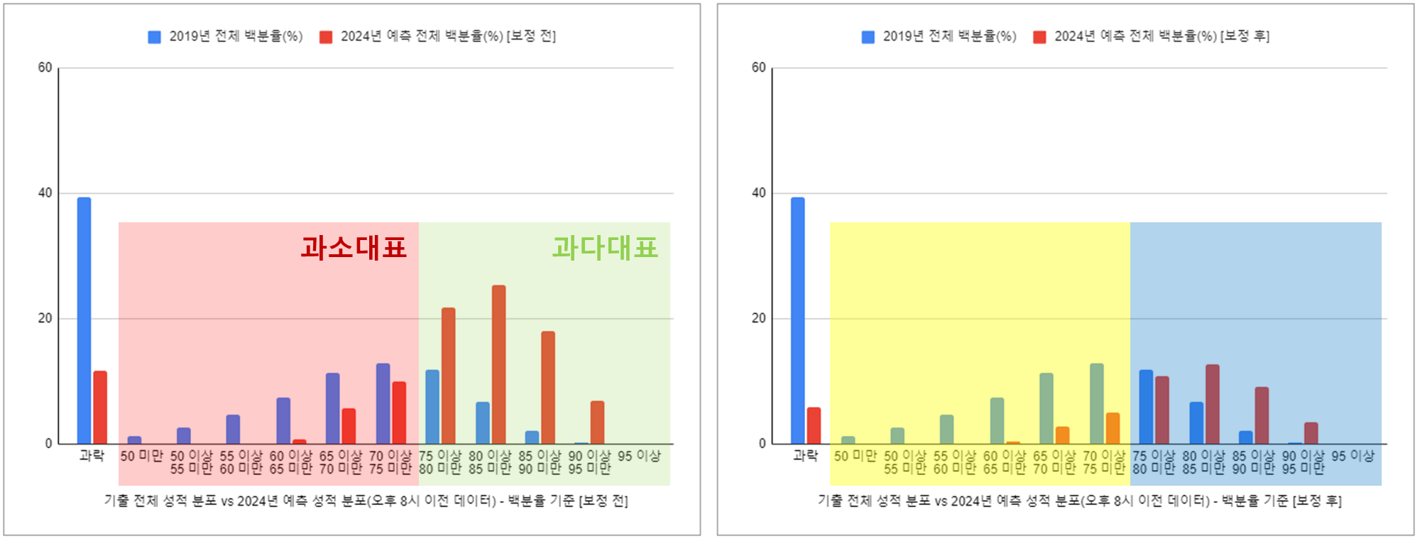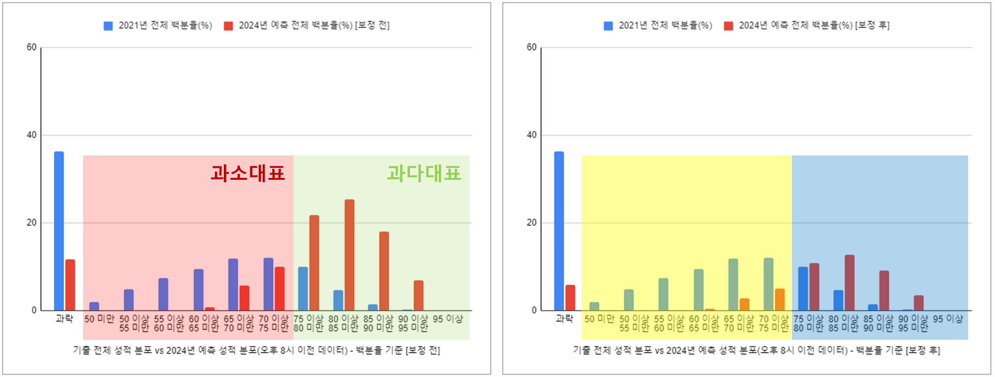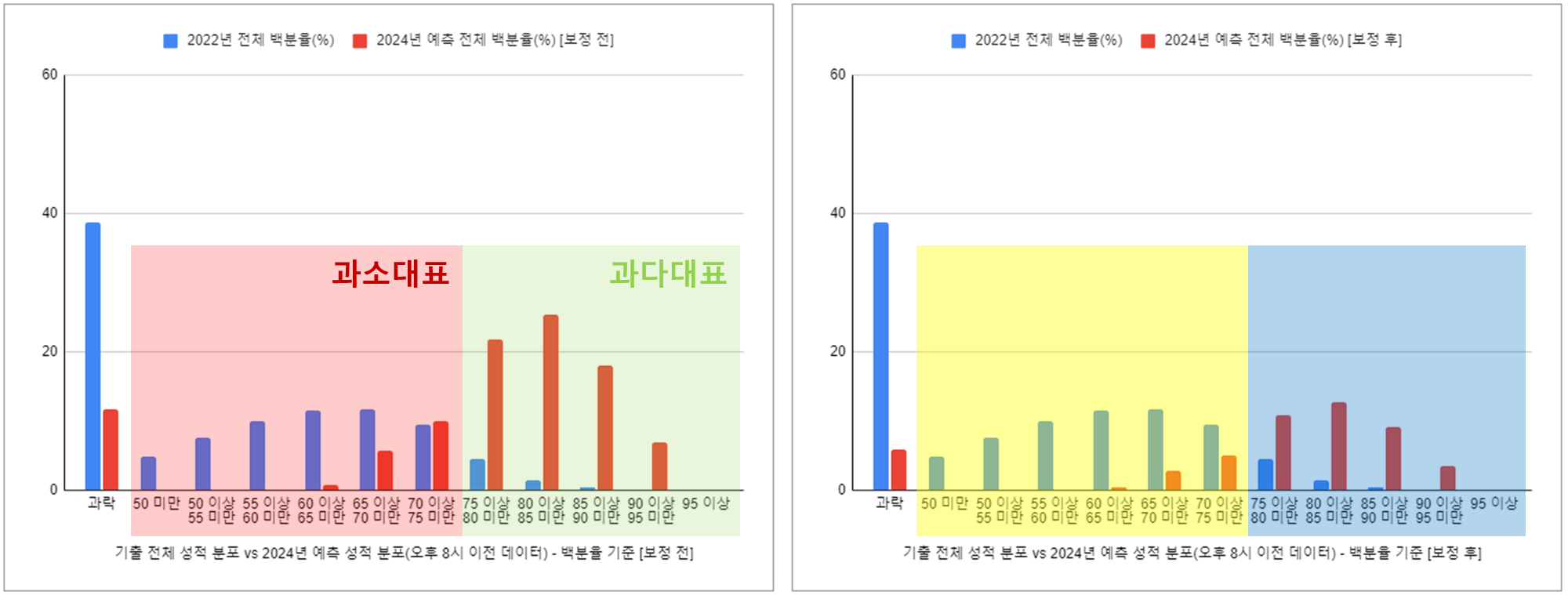 이 보정값은 이후 각 연도별 기출 통계와 비교할 때도 똑같이 적용했습니다.