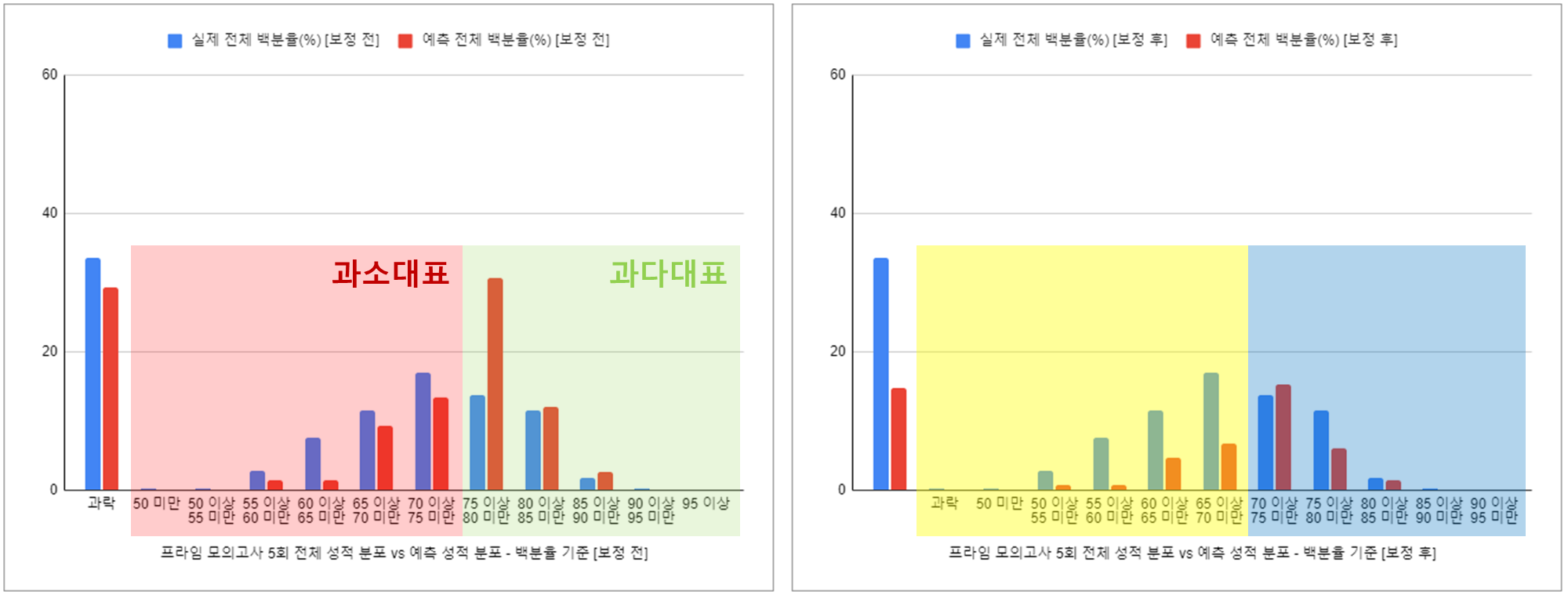 - 제5회 프라임 전국모의고사의 예측 및 실제 점수 분포 현황을 기준 샘플로 활용한다.