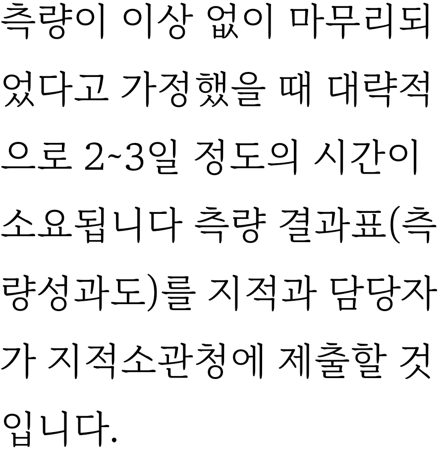 신청 후 30일 전후에는 측량 일이 결정되며, 한국국토정보공사에서 현장 확인 및 측량을 실시합니다.