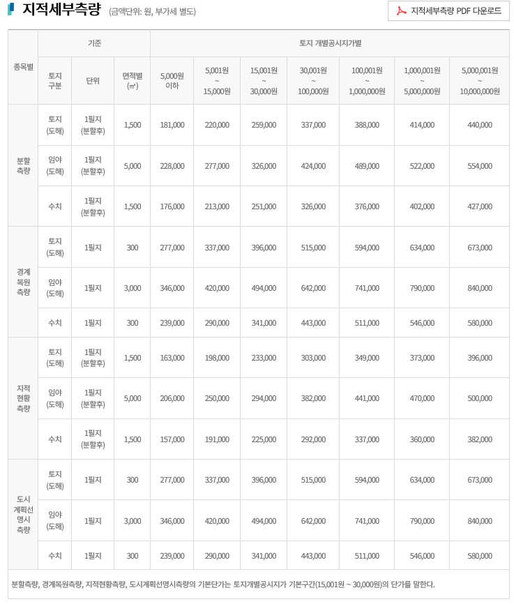 토지 분할측량은 토지의 구분, 필지수, 면적, 개별공시지가에 따라