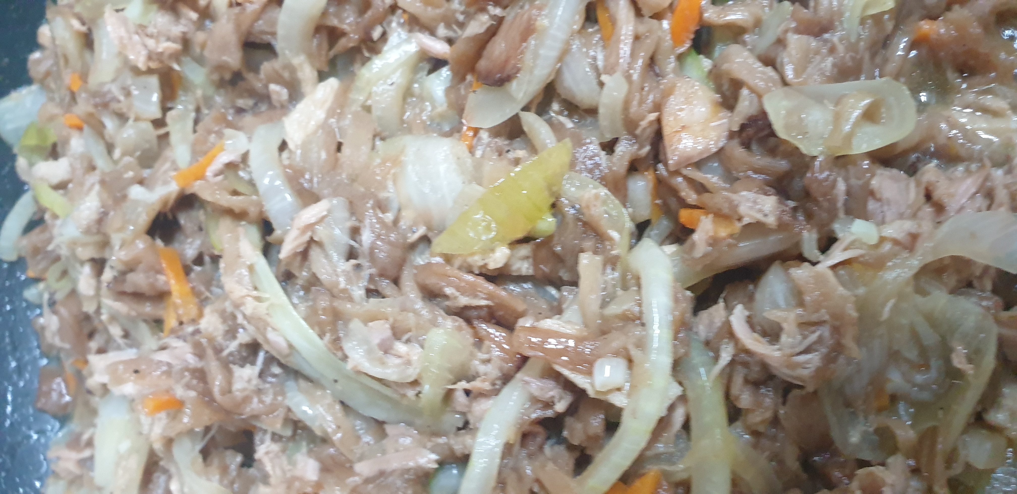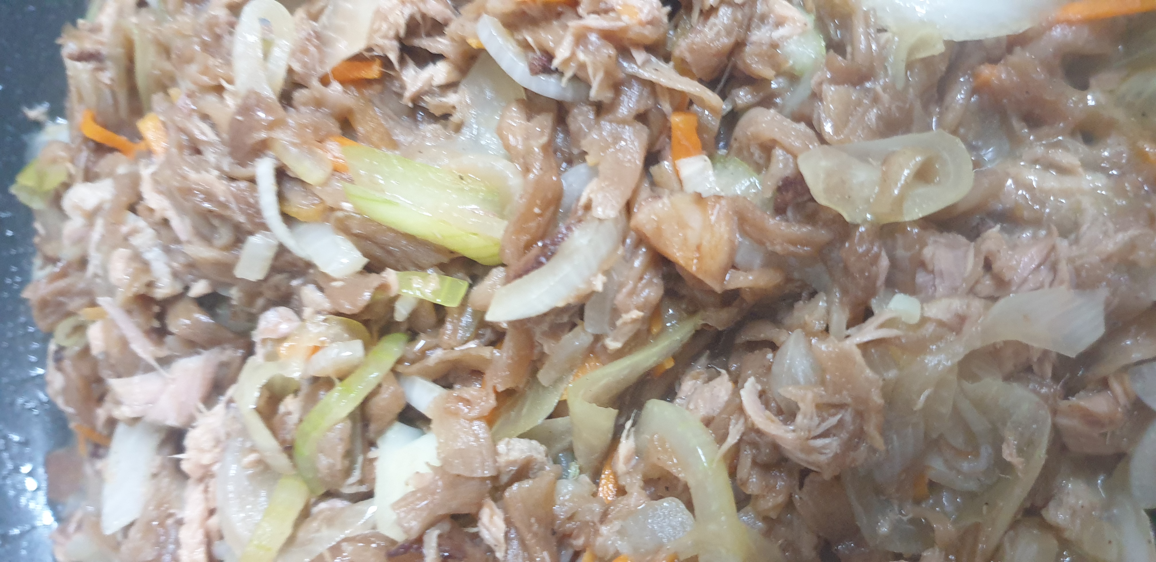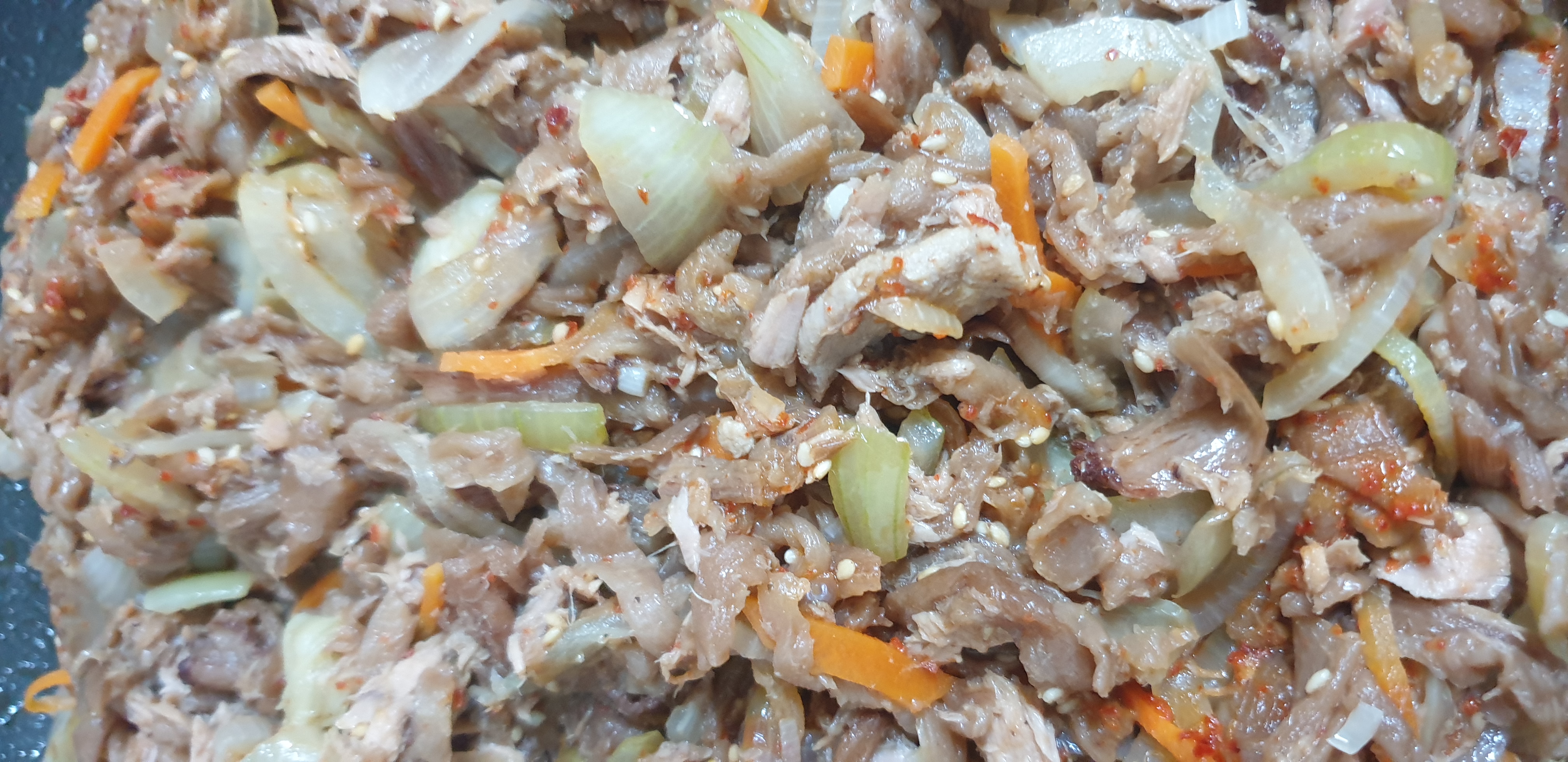 ㆍ참치캔 1개 넣고 버무려 볶아주고 불을 끄고 통깨 조금을 뿌리고 그릇에 담아 식힌다.