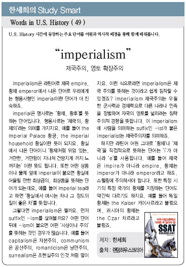 그렇다면 imperialism은 뭘까요. 먼저 suffix인 -ism를 살펴볼까요? 어떤 단어 뒤에 -ism이 붙으면 어떤 ‘사상이나 주의’를 뜻하는 것인 경우가 많습니다. 예를 들어 capitalism은 자본주의, communism은 공산주의, romanticism은 낭만주의, surrealism은 초현실주의 인 것처럼 말이지요. 이런 식으로라면 imperialism은 제국주의를 뜻하는 것이라고 쉽게 짐작할 수 있겠죠? imperialism 제국주의는 우월한 군사력과 경제력으로 다른 나라나 민족을 정벌하여 자국의 영토를 넓히려는 침략주의적 경향을 뜻합니다. 이 imperialism에 사람을 의미하는 suffix인 -ist가 붙은 imperialist는 제국주의자를 의미하죠.