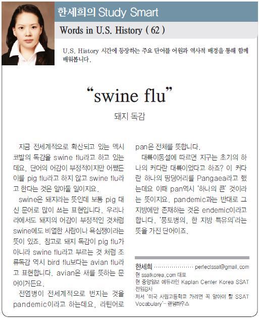 지금 전세계적으로 확산되고 있는 멕시코발의 독감을 swine flu라고 하고 있는데요, 단어의 어감이 부정적이지만 어쨌든 이를 pig flu라고 하지 않고 swine flu라고 한다는 것은 알아둘 일이지요.