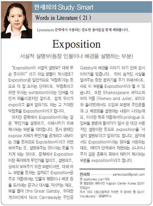 Exposition 서설적 설명부(등장 인물이나 배경을 설명하는 부분)