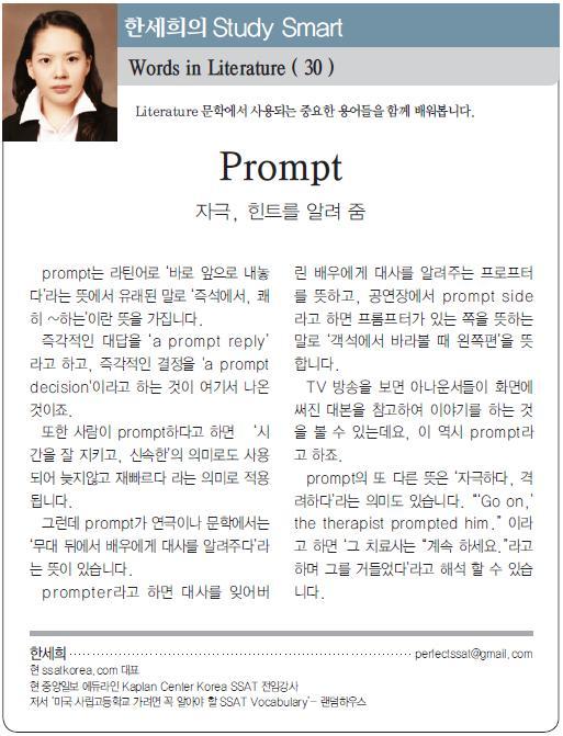 prompt는 라틴어로 ‘바로 앞으로 내놓다’라는 뜻에서 유래된 말로 ‘즉석에서, 쾌히 ~하는’이란 뜻을 가집니다. 즉각적인 대답을 ‘a prompt reply’라고 하고, 즉각적인 결정을 'a prompt decision'이라고 하는 것이 여기서 나온 것이죠.