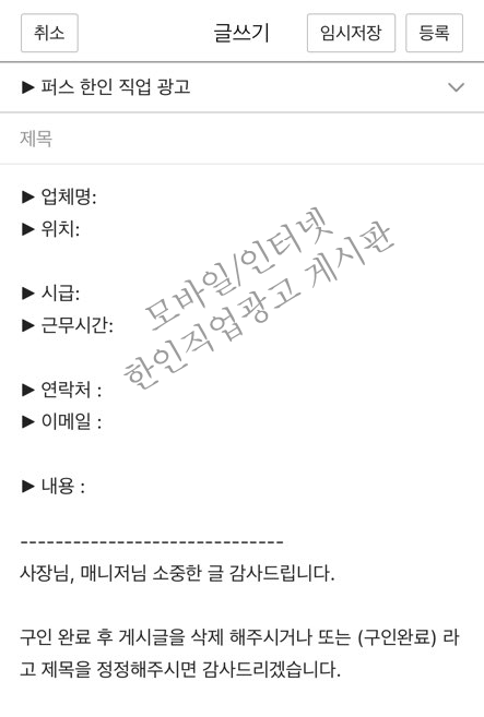 퍼스에 계신 한인 분들이 쉽게 구인/구직을 할수 있도록 적극적인 협조 부탁드립니다.