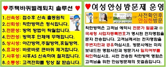 "큰 바퀴벌레가 벽을 타고 다니고 징그러워 죽을뻔 했는데 착한방역으로 다 박멸되서 정말 감사합니다--네,감사합니다.