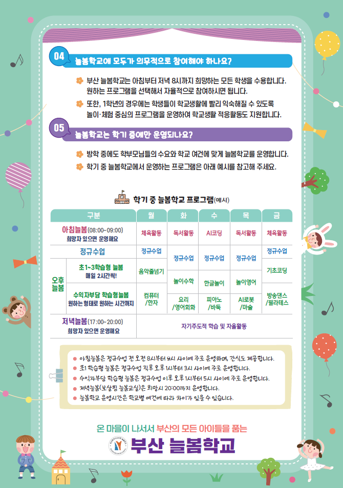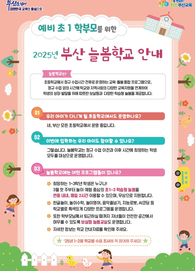 2025년 부산 늘봄학교 안내(예비초1 학부모) 작성자교육원감 김임영^^|작성시간24.11.25|조회수611 목록 댓글 0 글자크기 작게가 글자크기 크게가 * 초등학교에서 정규 수업시간 전후로 운영하는 교육-돌봄 통합 프로그램 안내-늘봄학교* 25년 1~2월 학교별 수요 조사에 참여해주시기 바랍니다. 다음검색 현재 게시글 추가 기능 열기 북마크 공유하기 신고 센터로 신고 댓글 댓글 0 댓글쓰기 답글쓰기 댓글 리스트