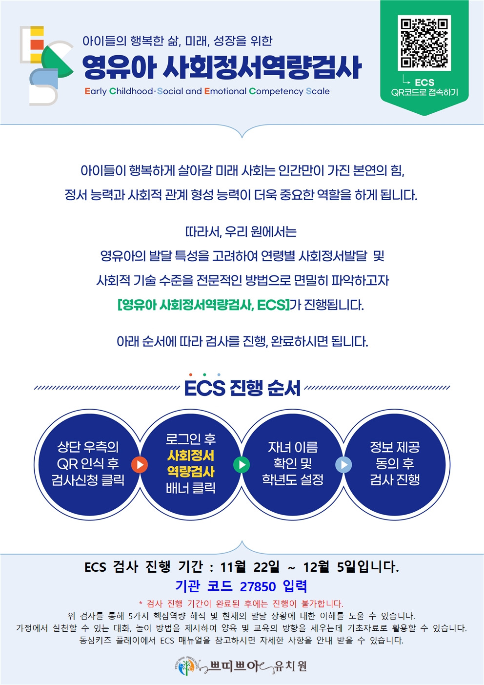 <ECS 영유아 사회정서역량검사 안내 : 12월 5일 마감> 작성자관리원감 김지애|작성시간25.11.21|조회수141 목록 댓글 0 글자크기 작게가 글자크기 크게가 쁘띠쁘아유치원 기관 코드) 27850*로그인 회원가입 시 필요한 기관 코드입니다 다음검색 현재 게시글 추가 기능 열기 북마크 공유하기 신고 센터로 신고 댓글 댓글 0 댓글쓰기 답글쓰기 댓글 리스트