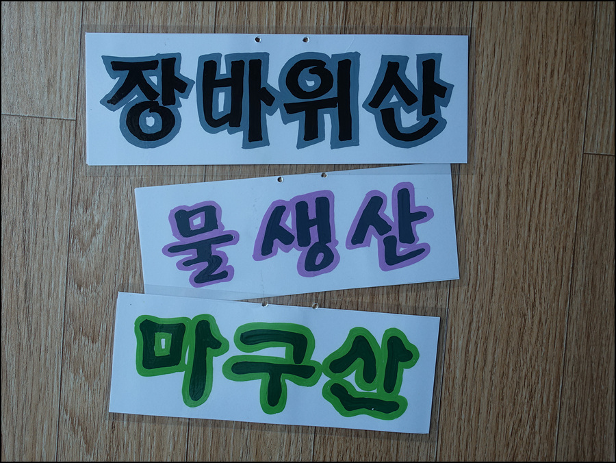 출발 전에 장바위산, 물생산, 마구산의 표지를 만들었다.