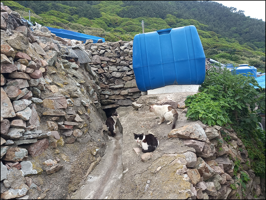 섬에는 먹을 것이 풍부하여 고양이들이 많은가 보다.