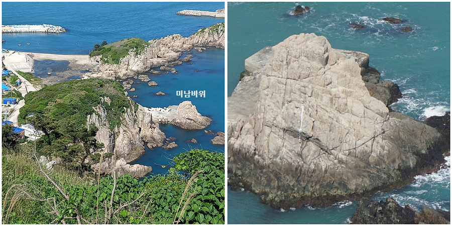 물생산에서 방파제 쪽을 내려다보면 미남바위가 보인다.