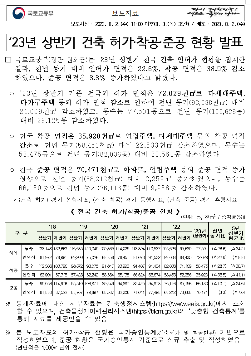 - 2023년 상반기 건축허가.착공.준공 현황