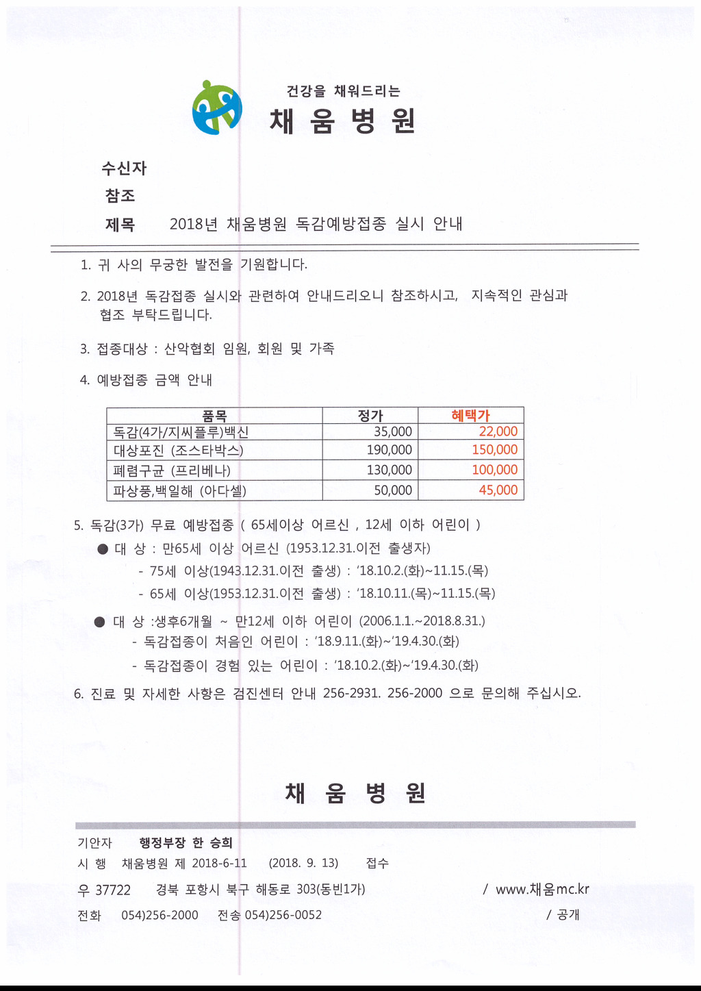 2018년 포항채움병원 독감예방접종 실시 안내 작성자포항시산악연맹|작성시간18.10.19|조회수238 목록 댓글 0 글자크기 작게가 글자크기 크게가 ※병원에 방문하시어 "포항시산악연맹 소속"이라 말씀하시면 독감 및 대상포진 등 예방접종 할인된 금액으로 접종 가능하오니 참고 부탁드립니다. 다음검색 현재 게시글 추가 기능 열기 북마크 공유하기 신고 센터로 신고 댓글 댓글 0 댓글쓰기 답글쓰기 댓글 리스트