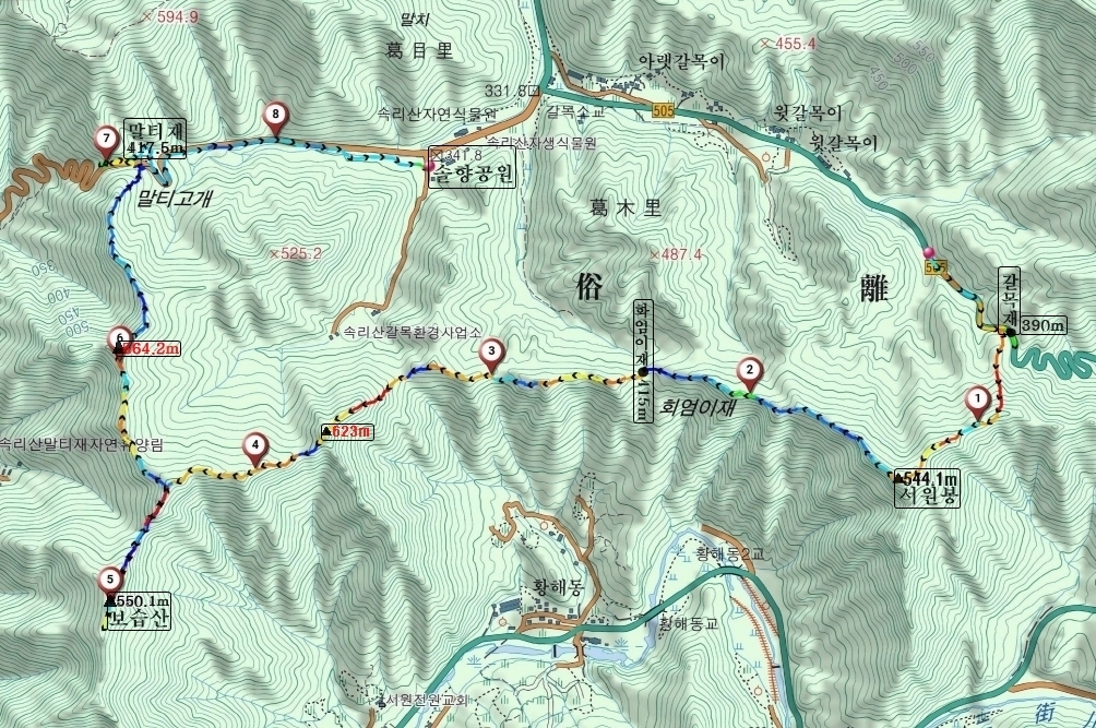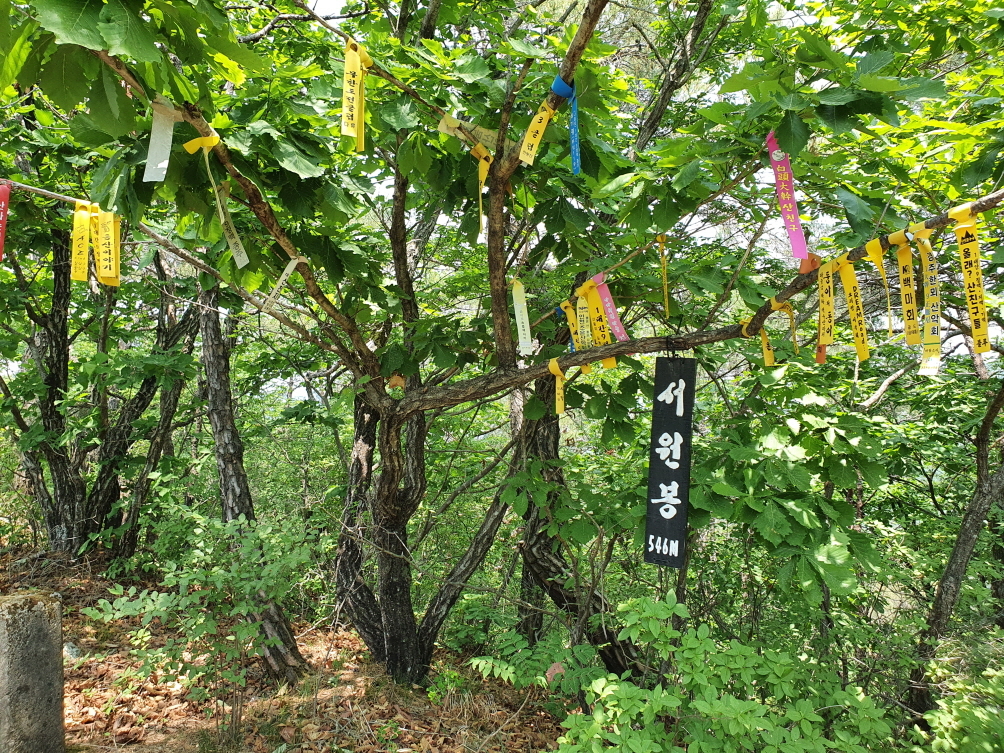 서원봉(544.1m)이고, 다시 서쪽 말티재 삼거리에서 정맥을 벗어나 남쪽 장내리 능선상에 솟아있는