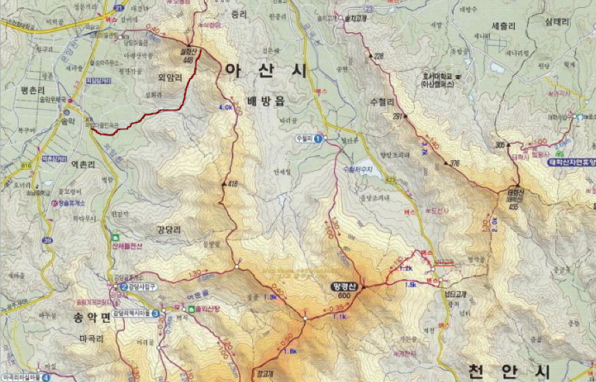넋티고개-480봉-망경산-망경산삼거리(광덕산갈림길)-절골임도-강당리갈림길-애기봉-작은봉-사거리안부-설화산- 조탁골-외암민속마을