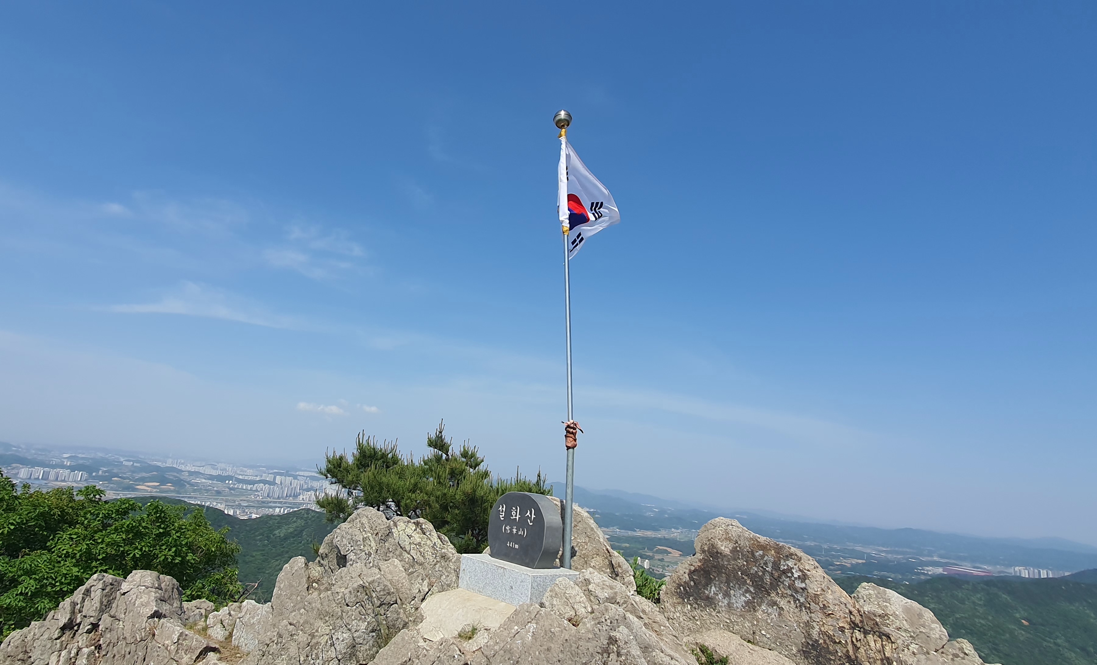 ▲설화산정상은 해발이 441m밖에 안되지만 태극기와 함께 작은 정상석이 자리하고 있고 사방으로 시야가 트여 조망이 탁월하다...