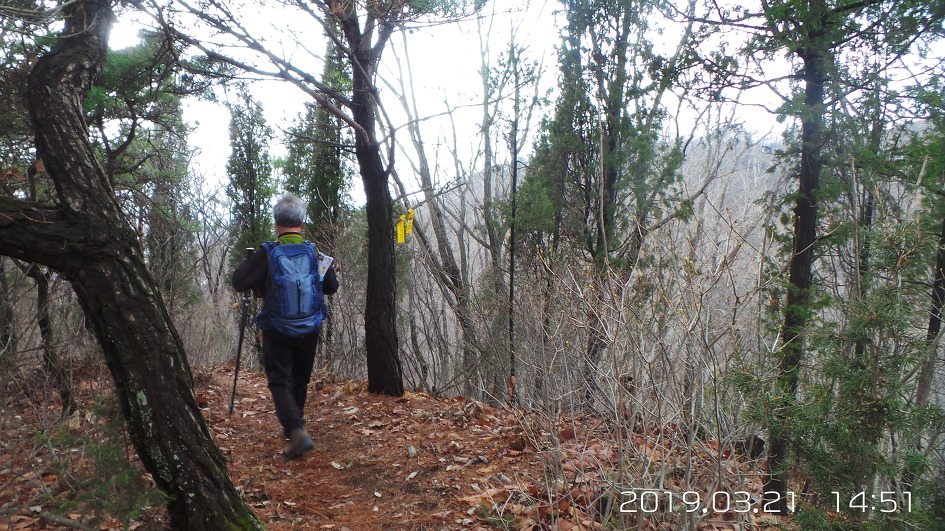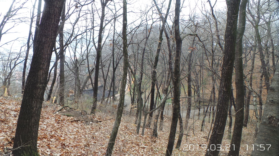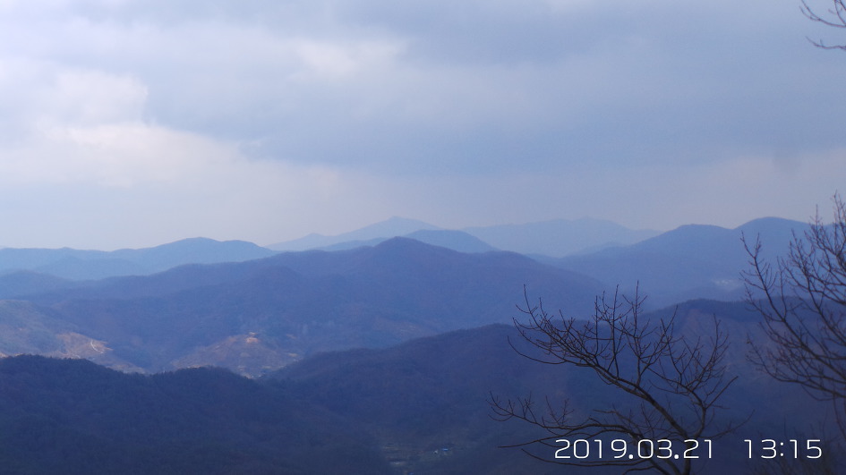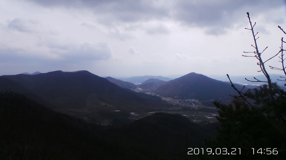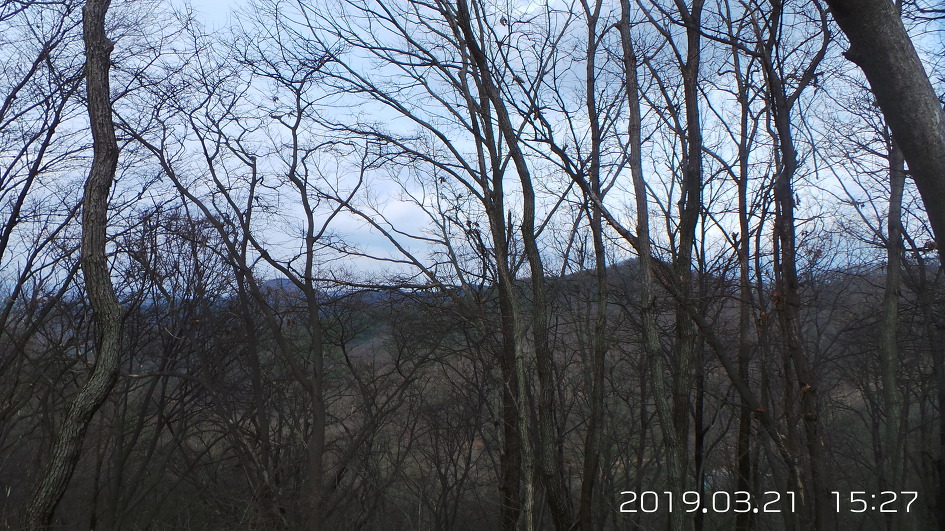 우측 잡목 사이로 우리가 진행했던 능선이 보인다. 남쪽으로 향하다 우측으로 크게 꺾어 북서쪽으로 진행하고 있는 셈.