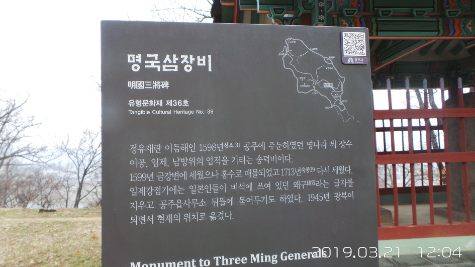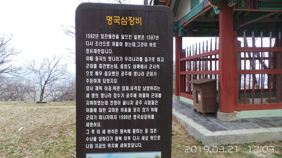 명나라 세 장수의 송덕비를 충청남도 유형문화재 제36호 '명국 삼장비'라 칭한다.
