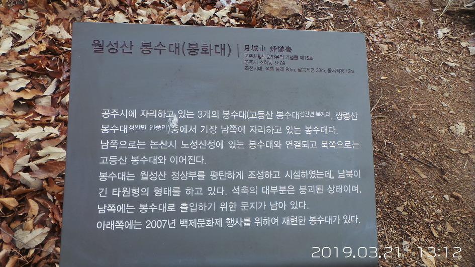 월성산 봉수대는 논산 노성산에서 보내는 봉수를 받아 정안면 북계리 고등산 봉수대로 보냈다고 한다.
