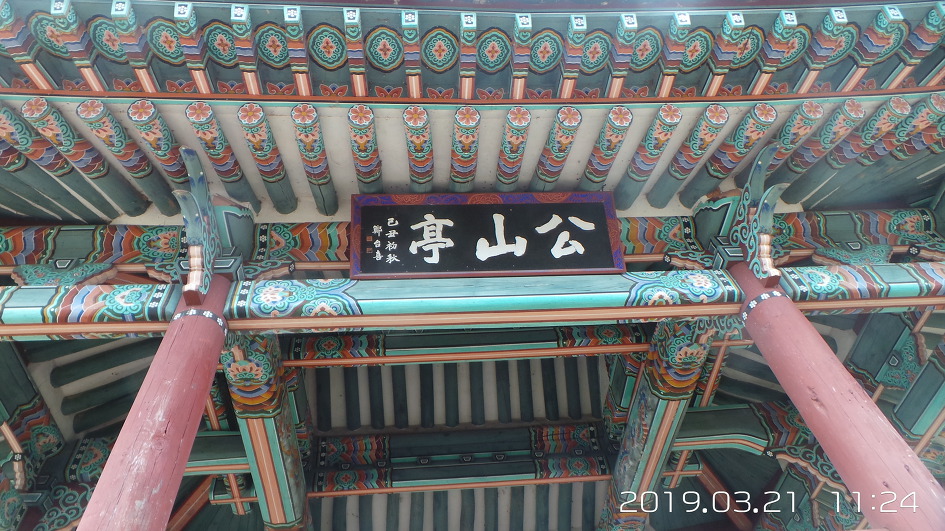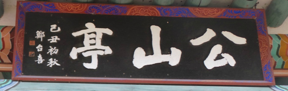 공산정(公山亭) 현판. 을축초추(乙丑初秋).을축년 초가을 정태희(鄭台喜). 송암(松巖) 정태희 선생은 서예가이자 교육자로 대전에서 활동.