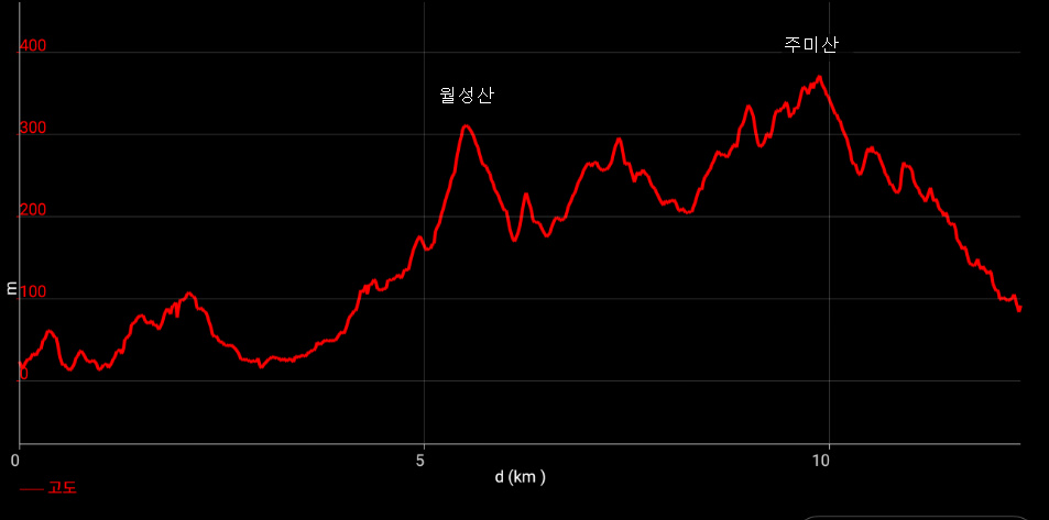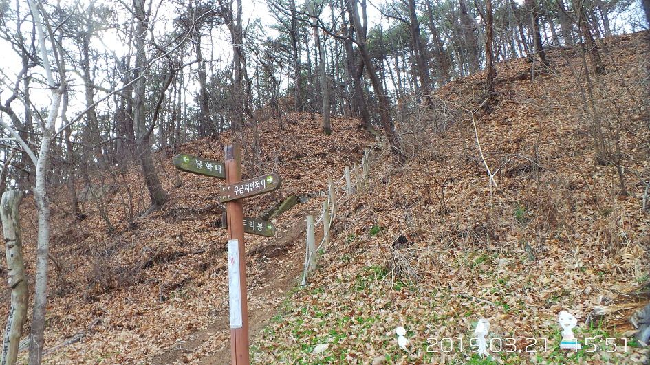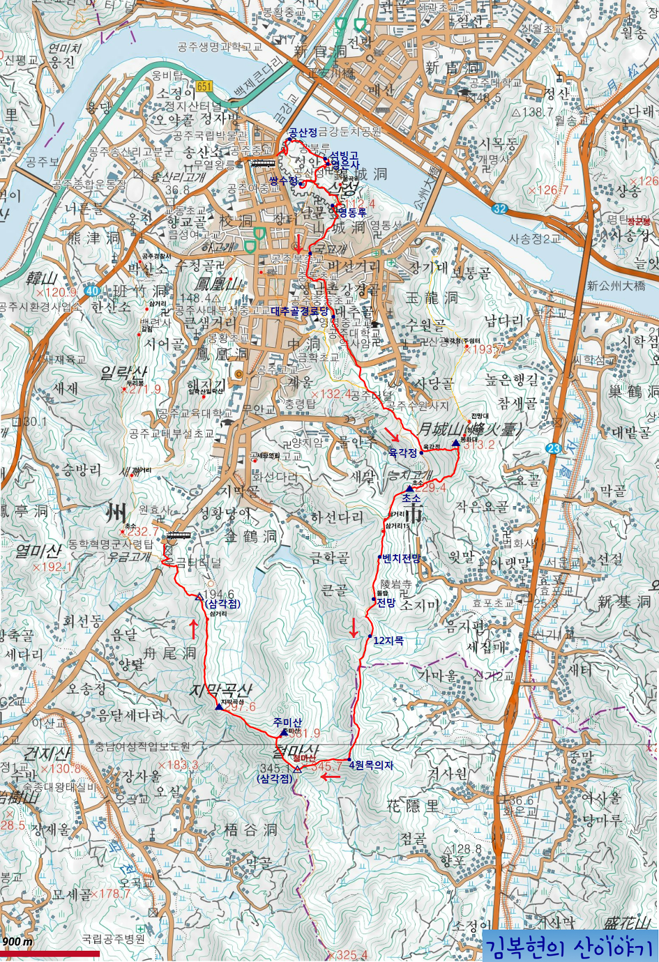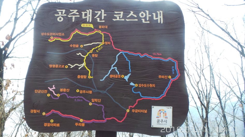 코스: 공산성-영은사-국고개-육각정-월성산(봉화대)-능치고개-산불초소-철마산(345)-주미산-지막곡산(298)-194.6삼각점-우금치(해발 약100m)