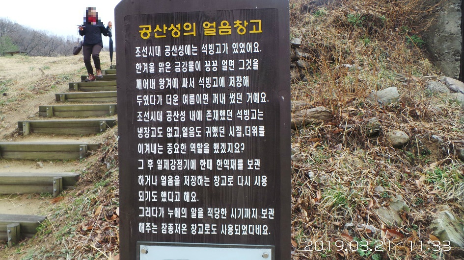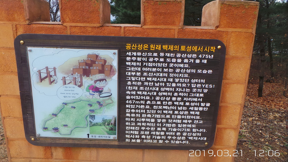 공산성의 석성은 대부분 조선시대의 것이지만 백제시대의 토성은 땅속에 그 흔적이 남아 있단다. 어린이들을 위한 안내판이다.