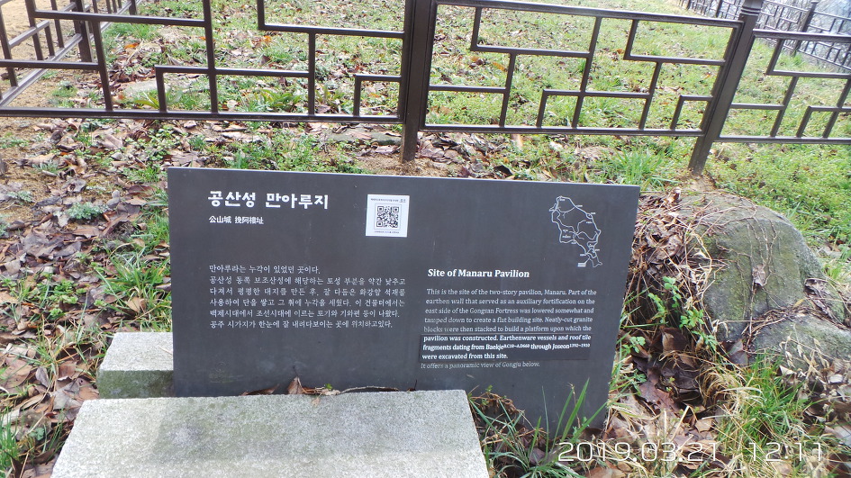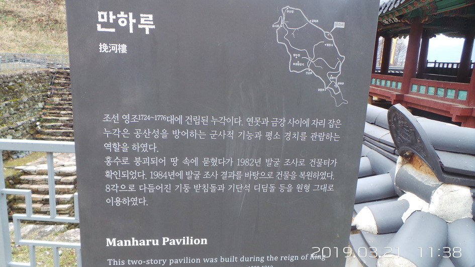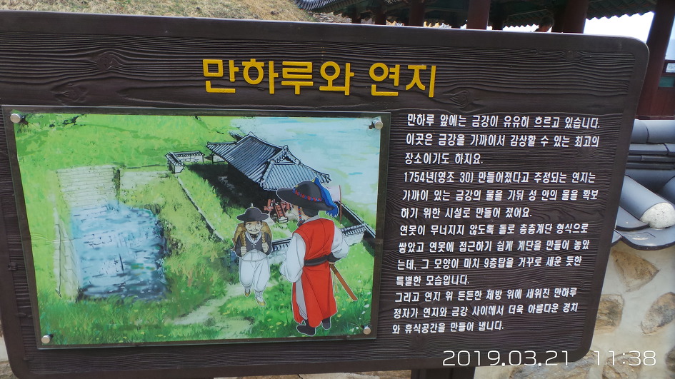 다가가며 연지와 만하루를 내려다 본다. 공산성 만하루는 공산성 동쪽 누대에 있는 군사적 기능이 중심이 된 누정이다.