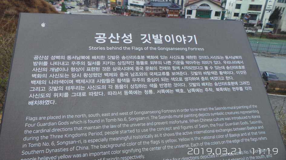 공산성 성벽의 동서남북에 배치한 깃발은 송산리고분군 6호분 벽화에 있는 사신도를 재현한 것.