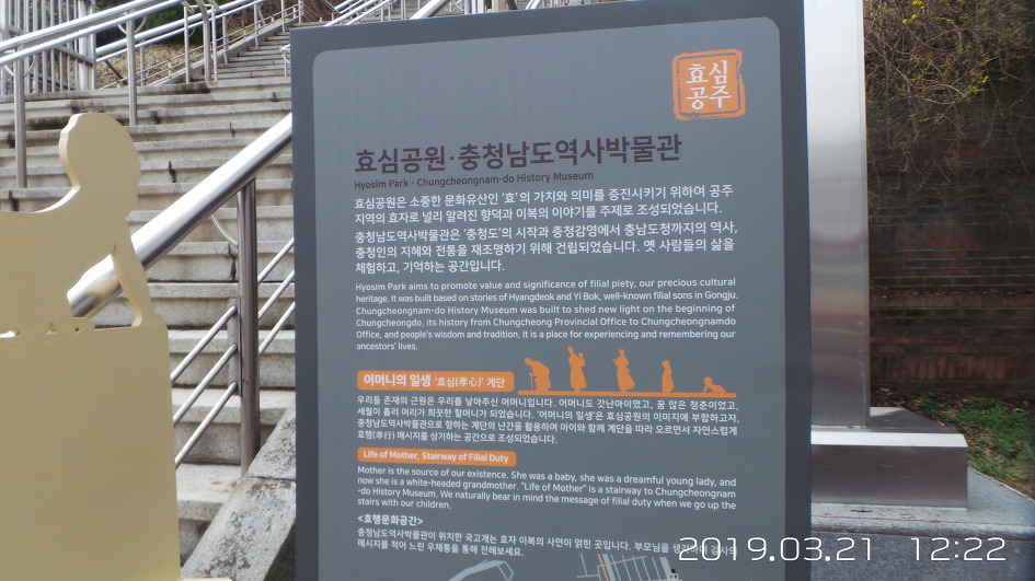 효심공원은 효의 가치와 의미를 증진하기 위해 공주의 유명한 효자 향덕과 이복의 이야기를 주제로 만든 공원.