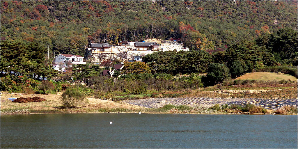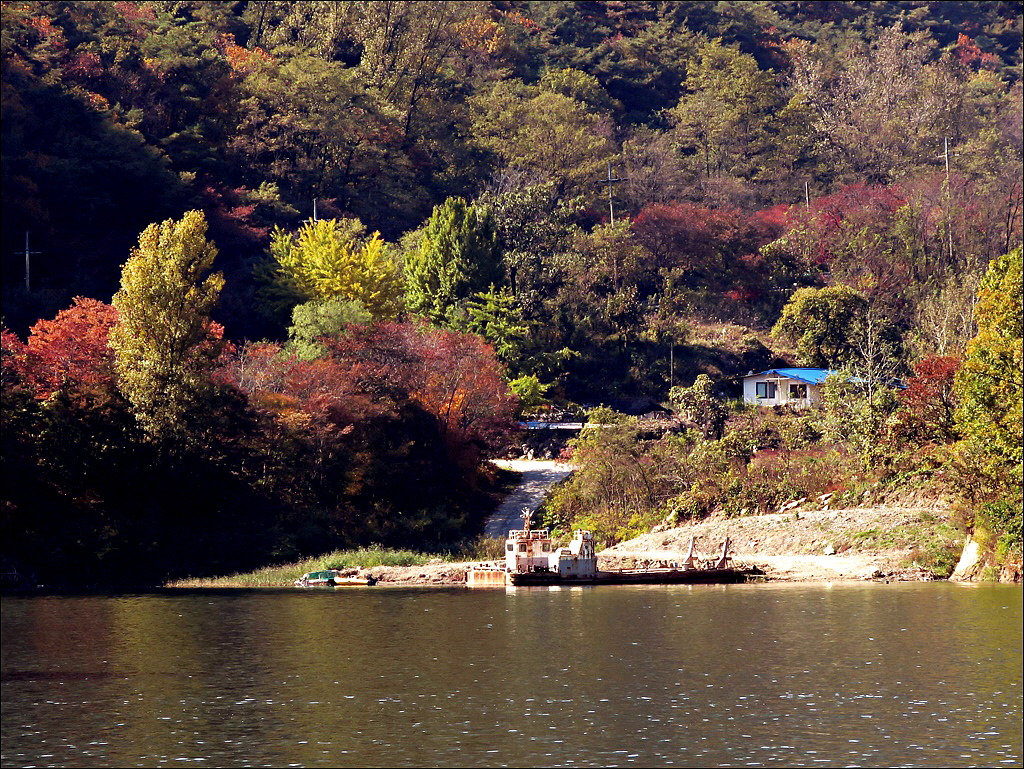 저 조그만 나루터는 그 위에 있는 천진선원 사찰에서 전용으로 사용하는 나루터이고 정박해 있는 배와 차량도 천진선원 소유다. 예전에 말목산을 타고 천진선원을 거쳐서 저 배를 빌려 타고 옛 장회마을 나루터로 건너온 역사가 있다.
