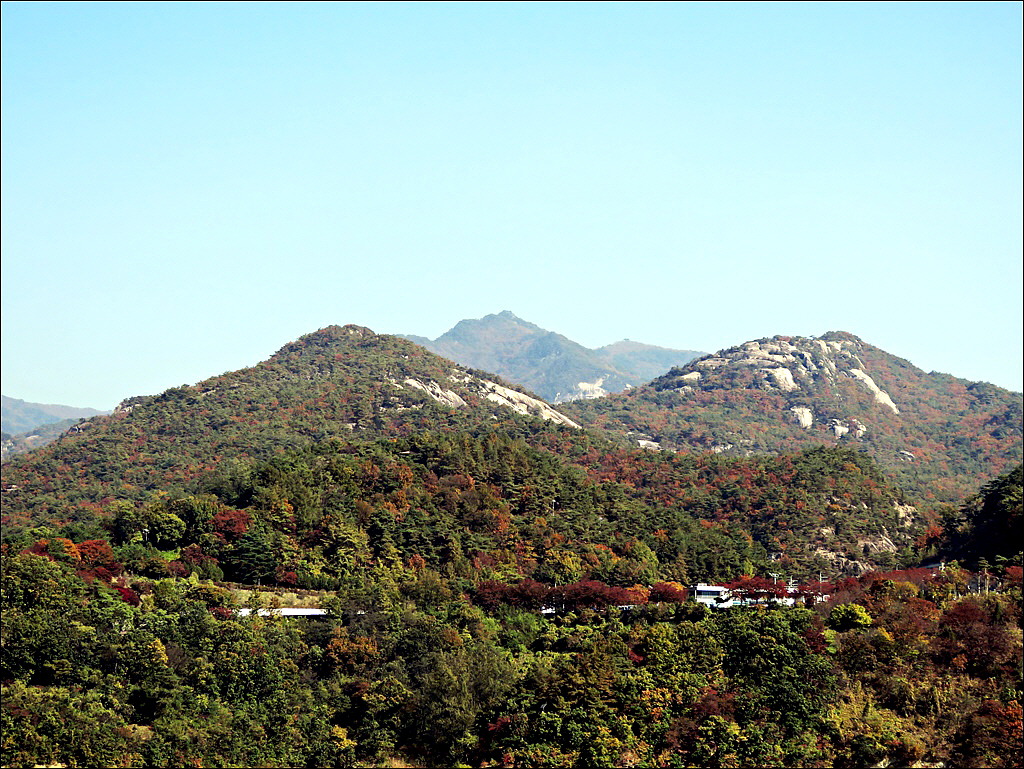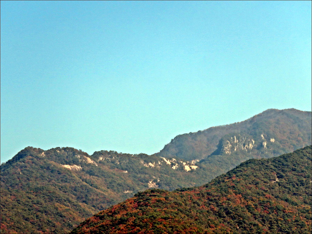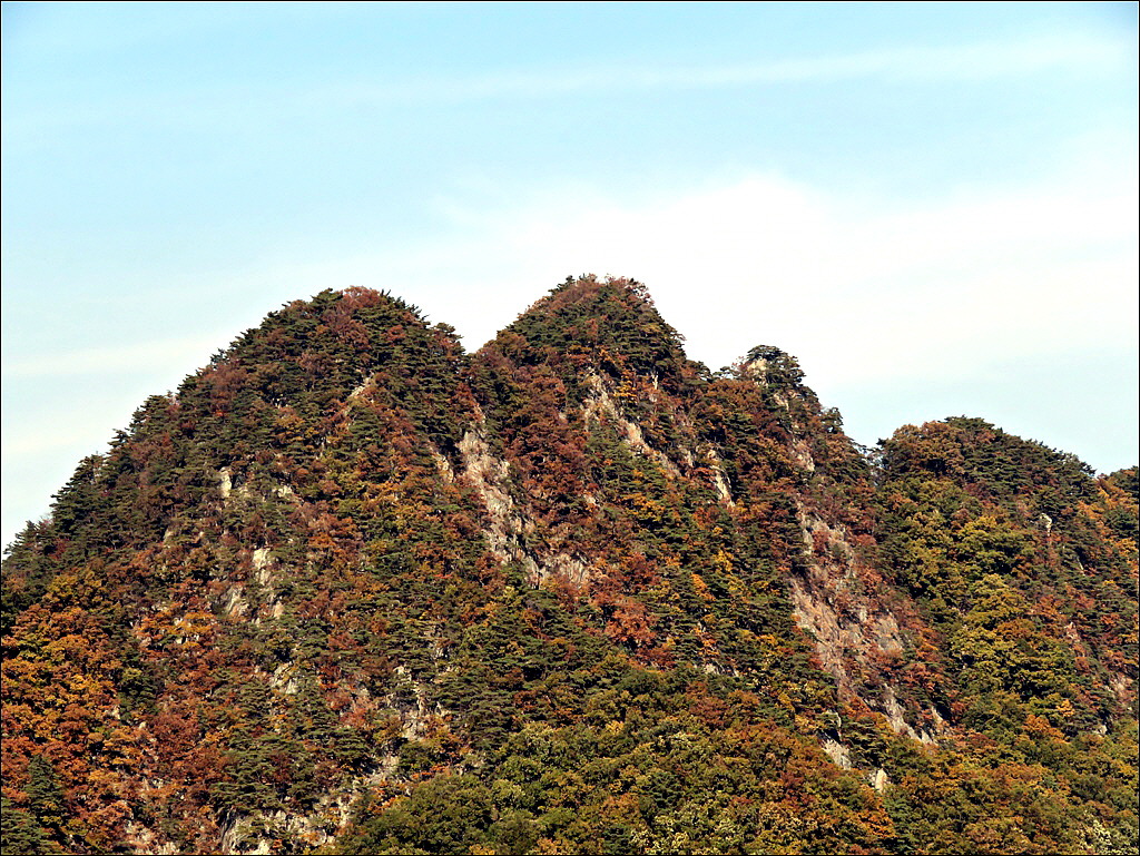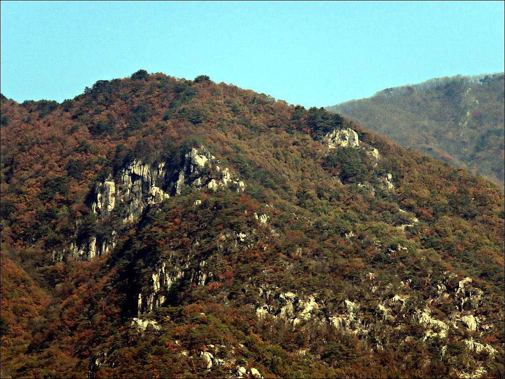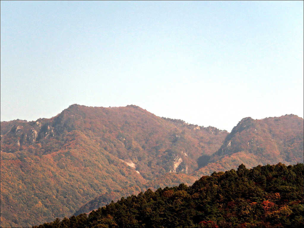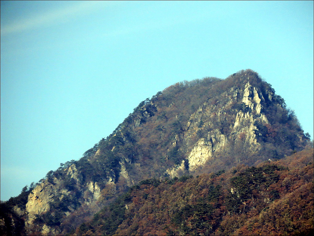 금수산이 솟아있고 좌측이 망덕봉에서 용담폭포 내려오는 능선 중앙에 정낭골 어댕이골 계곡 금수산 우측으로 서팽이 고개