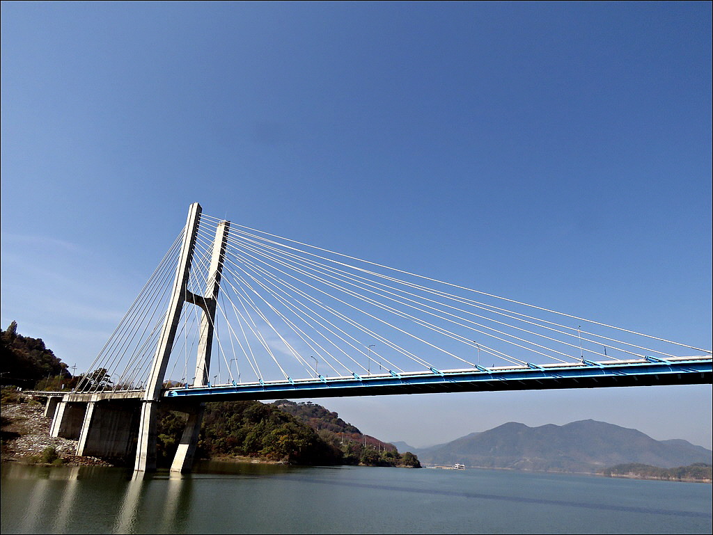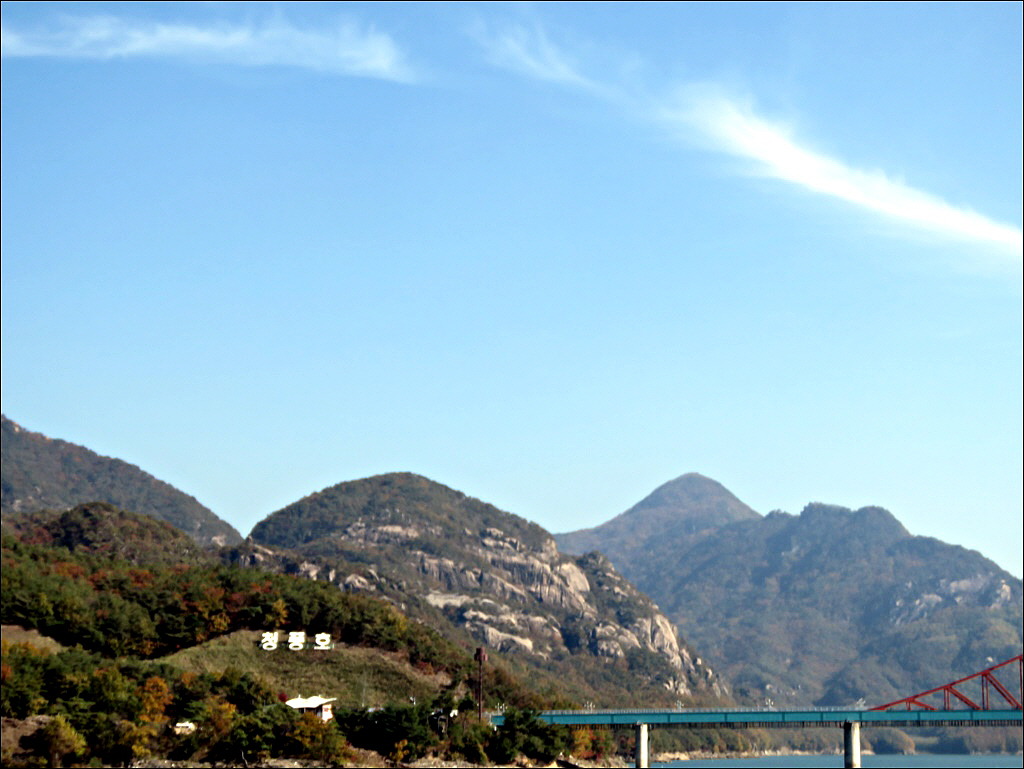 옥순대교 청풍호 글자 뒤로 둥지봉 오른쪽은 말목산 왼쪽은 가은산