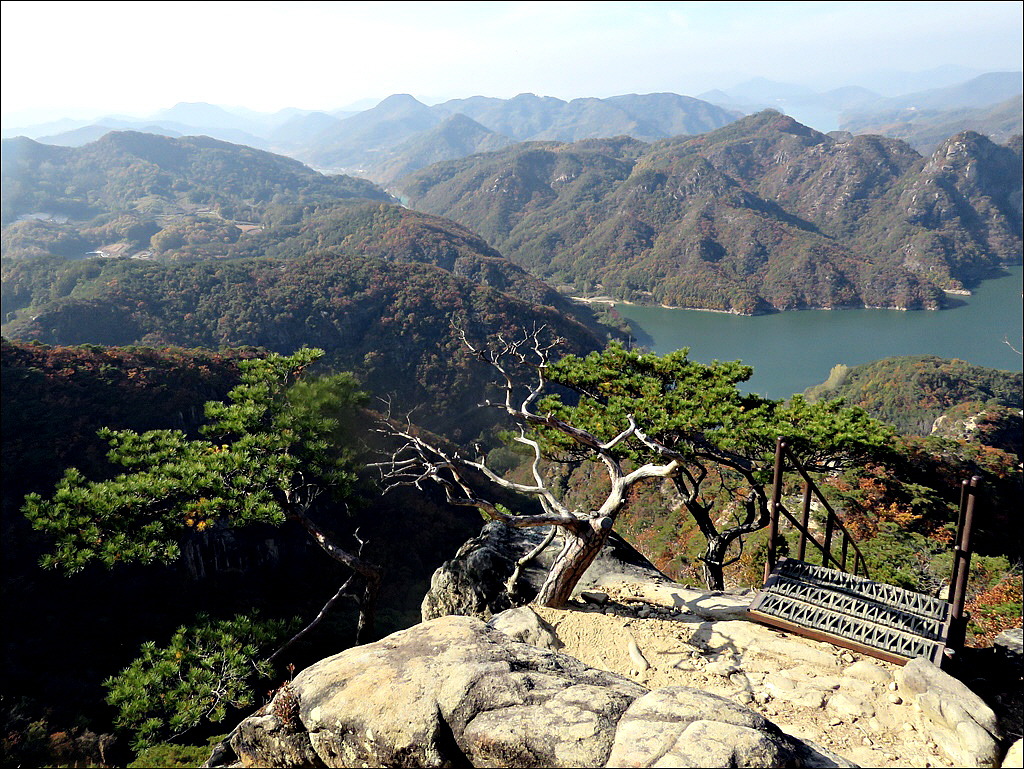 따라간 산방의 둥지봉 가은산 들머리 옥순교 끝머리 목책계단과 청풍호 전망정자가 보인다.