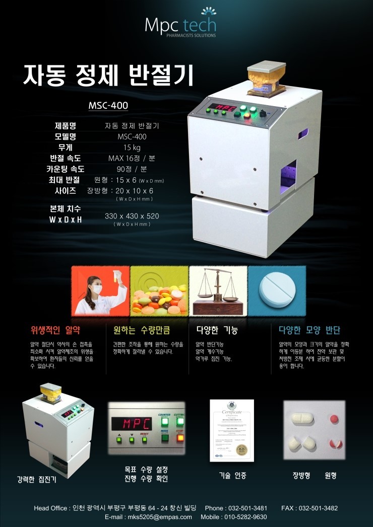 MSC-400은 올해 7월말 개발이 완료된, 민건식 대표의 손끝에서 탄생한 최신 알약 반단기다. 쉽게 말하면 알약을 반으로 잘라주는 기계로 조제량이 문전약국에서는 쓰임이 유용한, 니즈가 뚜렷한 제품이다.