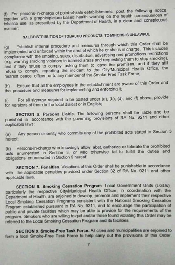 필리핀 수도권개발청(MMDA)은 수도권(Metro Manila) 각 시(市)와 함께 공공장소에서 흡연을 할 경우 처벌하는 등을 내용으로 한 흡연단속법(Tobacco Regulation Act)을 강력 시행하기로 하고 단속반을 가동 중이며, 6월부터는 경고를, 7월부터는 벌금 등 처벌을 하기로 하였습니다.