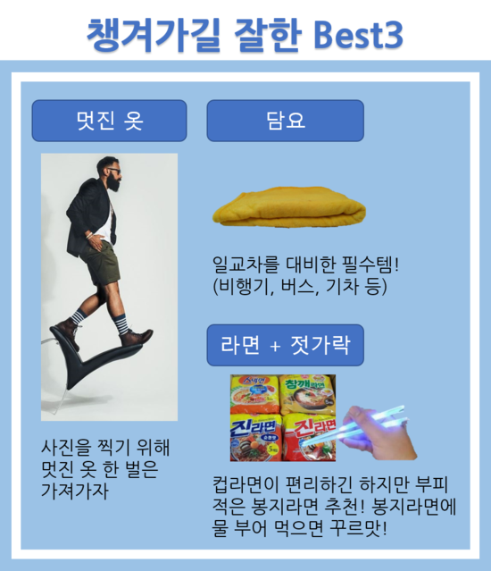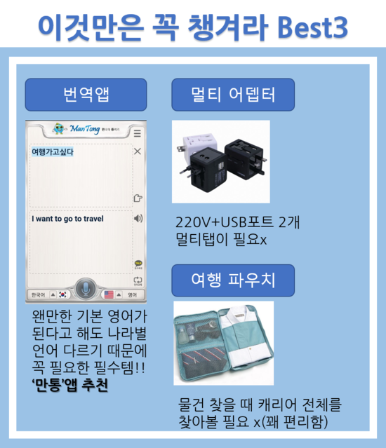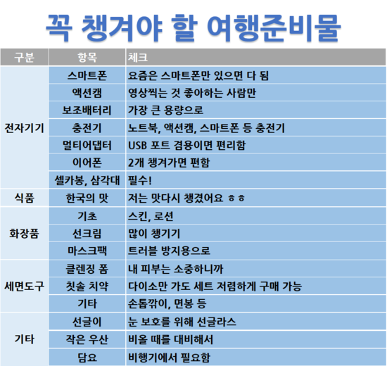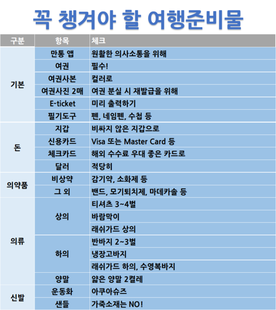 보편적인 준비물이기에 한번 더 체크해 보고 필요 없는것들은 빼놓고 여행에 꼭 필요한 물품이라면