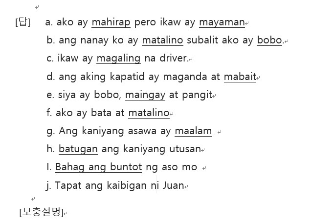 위 예문에서 보듯이 영어와 따갈로그어가 다른 점이 있지요?