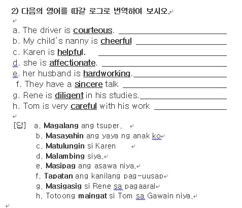 2) 다음의 영어를 필리핀언어로 바꾸어 보세요.