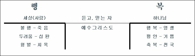 13) 그러므로/ 누구든지 듣고 믿는자는/ 예수 그리스도 안에서/ 가지게 될 것이다 행복을/ 불행 대신에