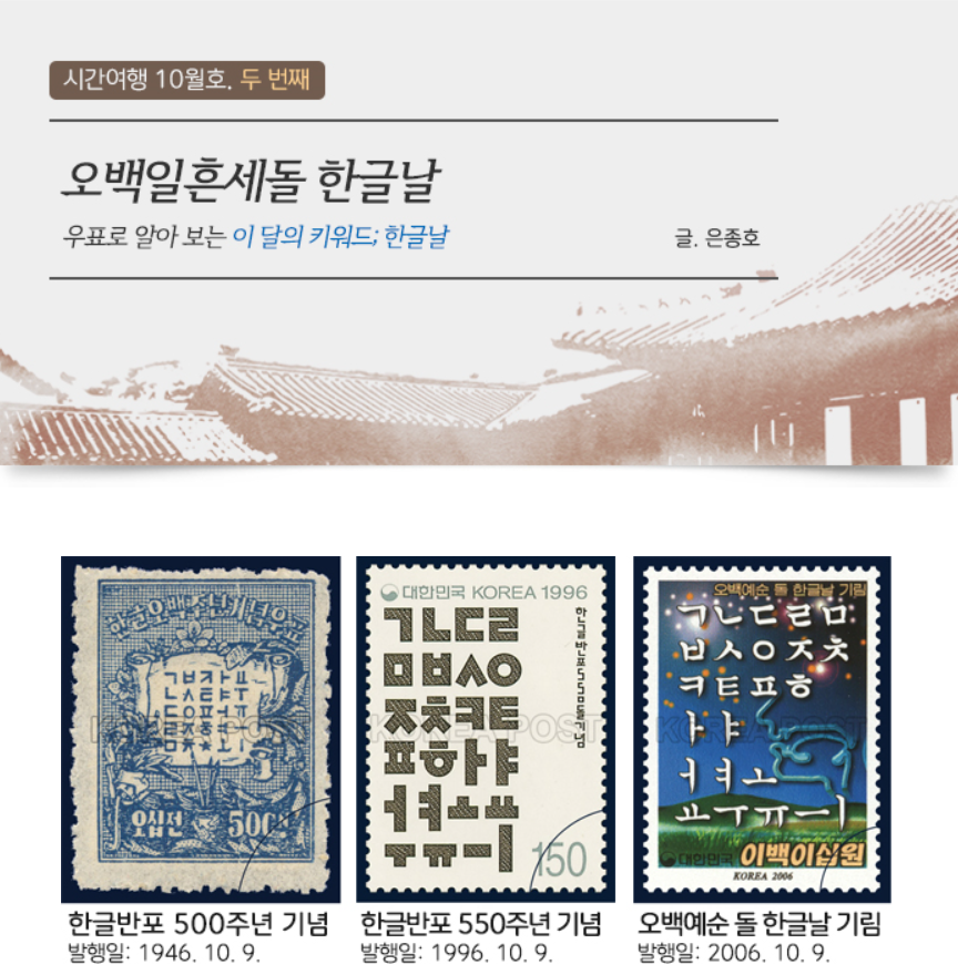 한글날 기념우표가 처음 발행된 것은 한글반포 500주년인 1946년이다. 이후 1996년과 2006년 한글반포 550돌과 560돌을 기념하여 우표를 발행하였다.