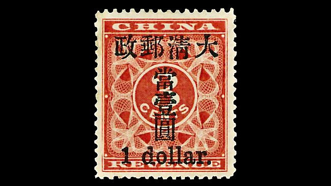 The bright red stamp, symbolising luck and good fortune in Chinese culture, is rare because the characters "Qing Dynasty postal service, one dollar" were considered too small, prompting the printing of a second version.