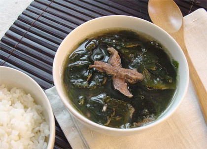 Mi yeok (dried seaweed) has iodine and calcium, which helps to stop bleeding and uterine contraction after labor a child. So it has been a tradition for nursing mother to have a lot of "mi yeok gook". What a clever idea!!!